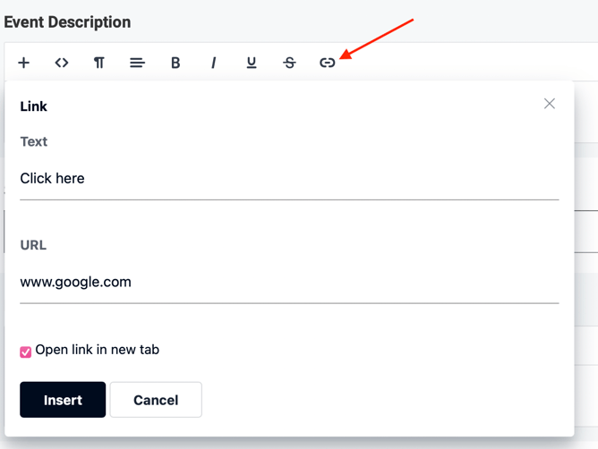To add a URL to the event description, add the text in which the user wishes to be displayed and add the URL. There is an optional checkbox for having the link open in a new tab. Once these fields have been completed, click "Insert".