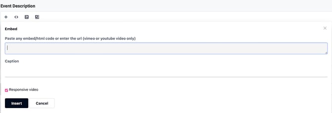 The "Embed" option allows users to embed a video within the event description. Currently only Youtube or Vimeo links are compatible. Users have the option of pasting the video link or the actual embed code.