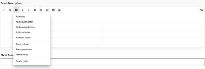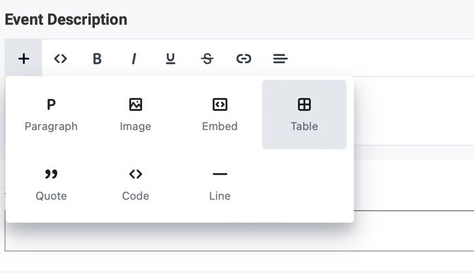 Users may add a table to the event description by selecting the "Table" option pictured below.